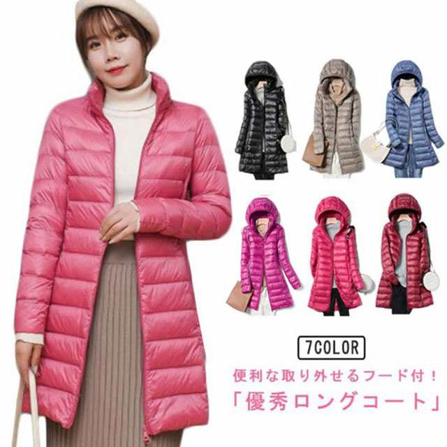 ダウンジャケット ダウンコート レディース ロング ライトダウン ポケッタブル 軽量 暖かい 薄型 フード付き スタンドカラー 大きいサイズ 撥水 防寒 スリム ナイロン