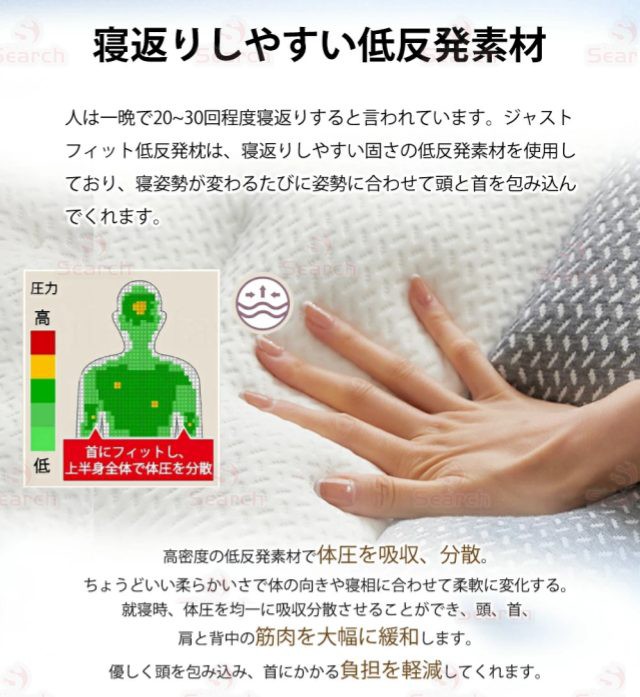 頭の重さをじんわりと枕に沈み込ませるように吸収、体にかかる圧力をしっかり分散する低反発素材を採用。まるで守られているように、安心してお休みできる心地よさを追求。