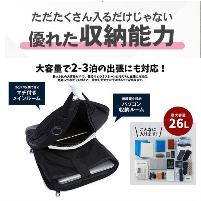 大容量で2?3日出張にも対応可能です。 多彩な収納ポケットを備えており、ノートパソコン、書類や小物など分けて収納できます。