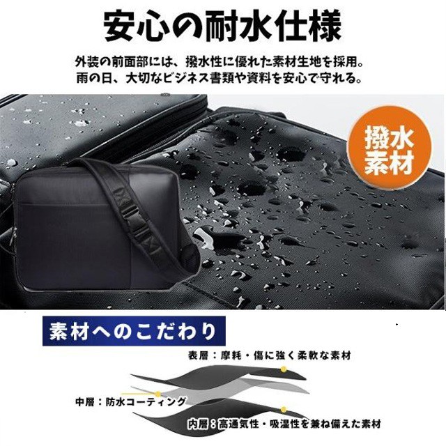 さらに、撥水性素材仕上げ、雨の日にも大切な資料を守れるビジネスバッグ。