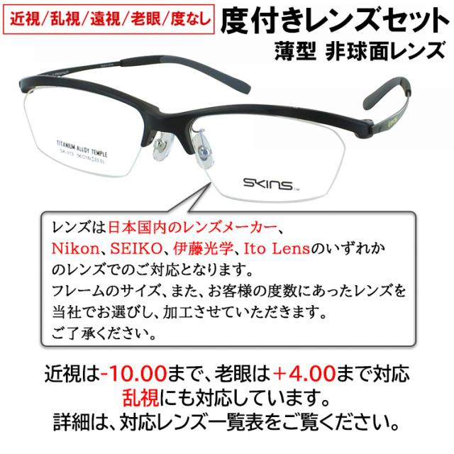 度付き メガネ 度入り 眼鏡 近視用メガネ ブランド SKINS スキンズ スポーティー 弾性樹脂 βチタン ハーフリム フレーム SK-313 スクエア クリングス鼻パッド 調整可能 近視 近眼 遠視 老眼 乱視対応 度なし だて 伊達 薄型 非球面レンズセット UVカット メンズ 男性
