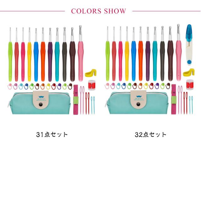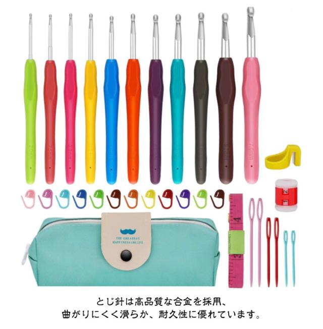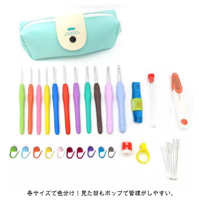 | かわいい専用ポーチ付きかぎ針セット初心者も嬉しい、かぎ針編み道具31/32点のお得なセットです。 ソフトグリップは手に優しくフィットして持ちやすい形状、長時間使っても疲れにくい仕様です。 糸が外れにくく、引きやすい、目が落ちにくい形状の針先。 各サイズで色分け!見た目もポップで管理がしやすい。 号数の表記が掘ってあるため、擦れ消えて太さがわからなくなることがありません。 とじ針は高品質な合金を採用、曲がりにくく滑らか、耐久性に優れています。 ケースはかぎ針編みとアクセサリーが全て保管でき、コンパクトで持ち運びにも便利。 | |