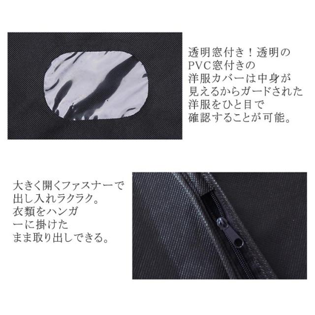 | 耐久性抜群!不織布+ PVCの材質、耐久性に優れ、大切な洋服をホコリ、カビ、虫や汚れからしっかり守って、安心して保管できます。 大きく開くファスナーで出し入れラクラク。衣類をハンガーに掛けたまま取り出しできる。 ロングサイズなのでスーツはもちろん、コート、ワンピースなどの収納にもオススメ。 通気性の良い不織布でスーツや洋服を湿気やホコリから守り大切に保管。 透明窓付き!透明のPVC窓付きの洋服カバーは中身が見えるからガードされた洋服をひと目で確認することが可能。 多用途&便利!クローゼット内の収納・通勤・出張・旅行・引越しの時に大切な服と日常の服をとりわけて収納保管します。 | |