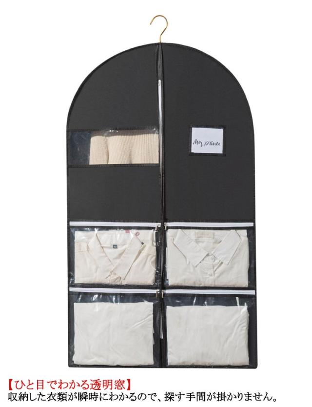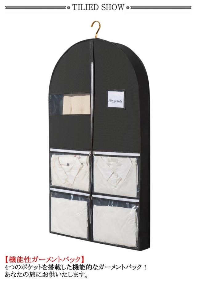 | 「旅のお供に」機能性ガーメントバック登場!4ポケット搭載なので、旅に必要な靴や小物をひとまとめに! 【機能性ガーメントバック】 ・4つのポケットを搭載した機能的なガーメントバック!あなたの旅にお供いたします。 【ひと目でわかる透明窓】 収納した衣類が瞬時にわかるので、探す手間が掛かりません。 【使いやすいダブルジッパー】 ・耐摩耗性と滑らかさを兼ね備えたダブルジッパーで出し入れが快適。 【ハンガーの通し口】 ・お手元のハンガーでクローゼットに保管可能!※ハンガーは付属しません。 | |