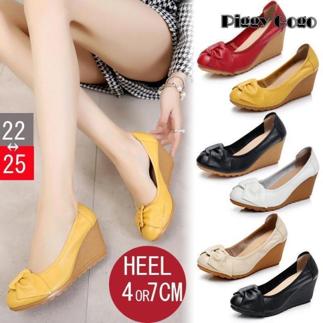 ウェッジソールシューズ ローヒール パンプス ラウンドトゥ 履きやすい 疲れにくい 30代 40代 50代 コンフォートシューズ ヒール 厚底 リボン