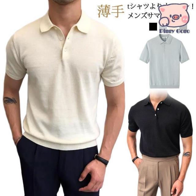 サマーニット ポロシャツ 半袖 メンズ カットソー 薄手 夏服 Tシャツ サマーセーター 無地 着〓せ 紳士 ゴルフウエア トップス カジュアルシャツ