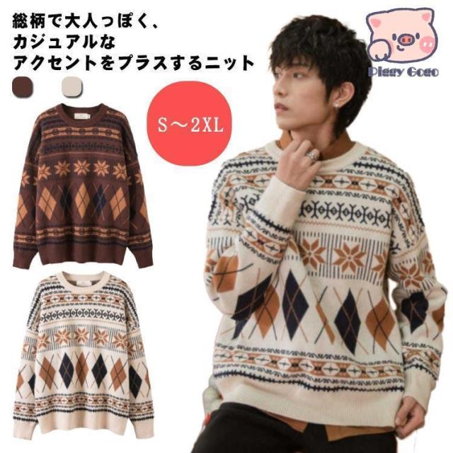 セーター メンズ 総柄 ノルディック 柄 ニットセーター 長袖ニット セーター カジュアル 秋冬 厚手 暖かい ざっくり ニット トップス