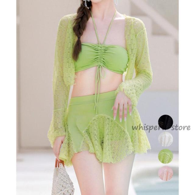 レースアップ ホルターネック水着 ジャガードレースラッシュガード バンドゥビキニ 3点セット 大人セパレート水着 水遊び