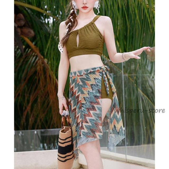 ワンショルダー水着 ビキニ 総柄パレオ ショートパンツ セパレート水着 巻きスカート スイムウェアビスチェ水着