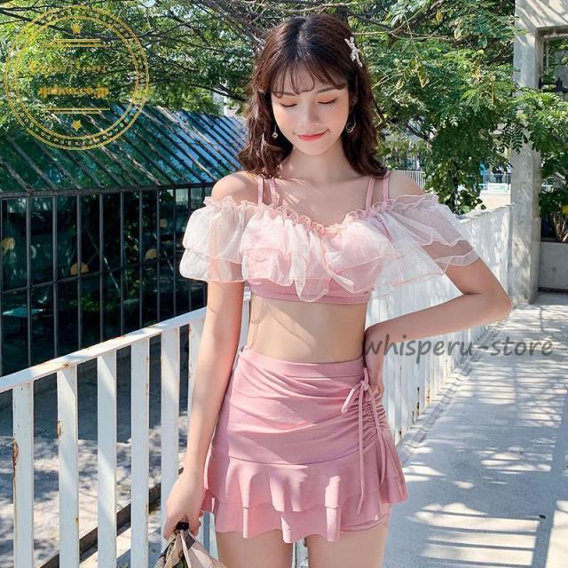 ビキニ 水着 レディース 体型カバー かわいい 半袖 ハイウエスト スカート セパレート パッド付き 2点セット 韓国ファッション 水着 リゾート