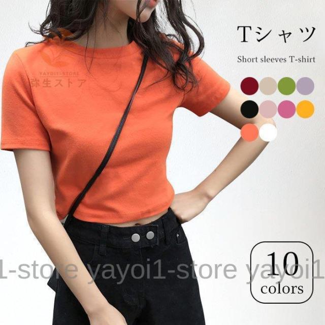 Tシャツ レディース カットソー ショート丈 ショートTシャツ 半袖 無地 ラウンドネック クルーネック へそだし トップス