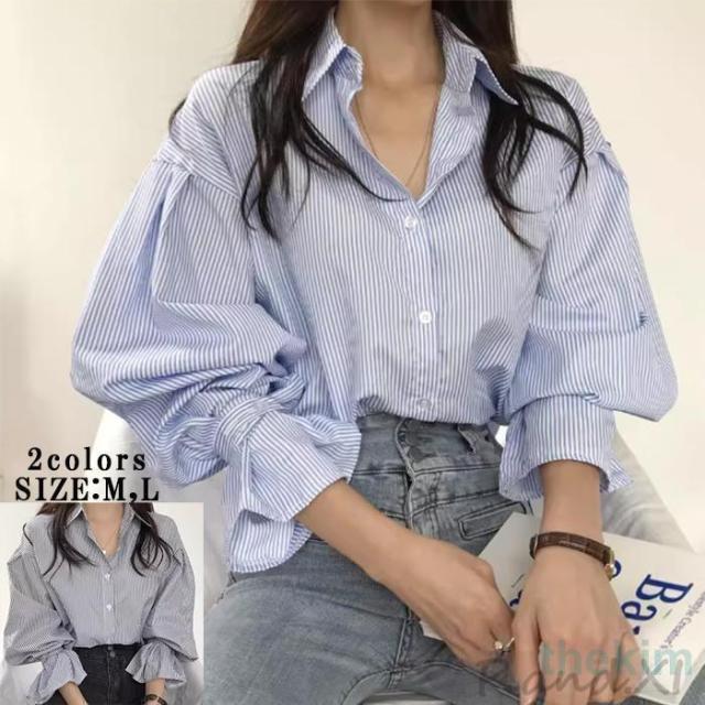ブラウス レディース シャツ フリル袖 ラッパ袖 長袖 トップス コットン 綿 ストライプ オーバーシャツ 春 夏 秋 大きめ BIG