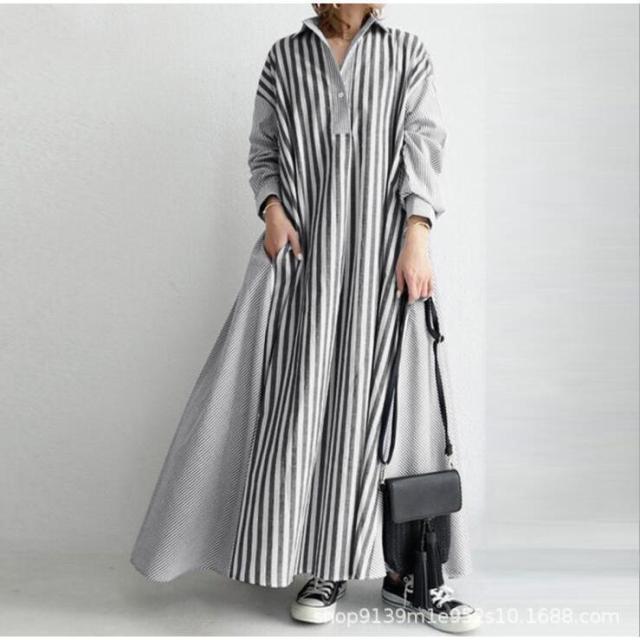 シャツワンピース ワンピース レディース ロングワンピース 長袖 秋 秋冬 春 超ロング ロング丈 マキシ丈 長袖 40代 体型カバー ストライプ柄 ゆったり