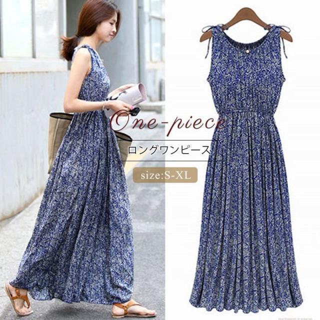 ロングワンピース レディース 夏 ワンピース マキシ丈 花柄 ノースリーブ キャミワンピ リゾートワンピース 旅行 ラウンドネック ウエストゴム 送料無料 20代 30代 40代 50代 ハワイワンピ