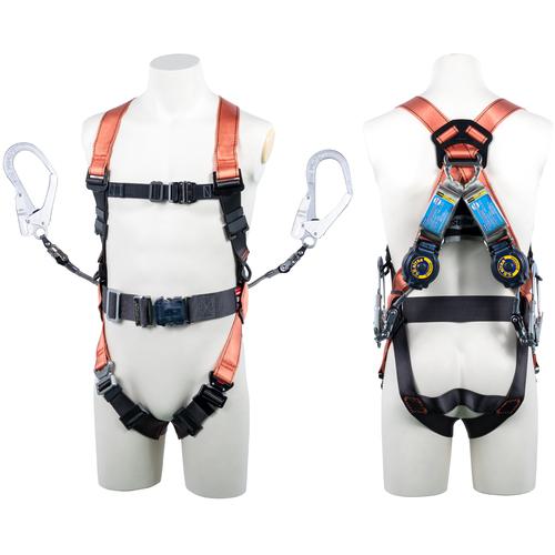 TSUYORON コアハーネス 胴ベルト付き ツインランヤード付き ロック機構付き巻取式SRリトラ オレンジ Mサイズ〔品番:TH-502-2TR93SV-OT-M-OR-2R23-BX〕[注番:1635020]