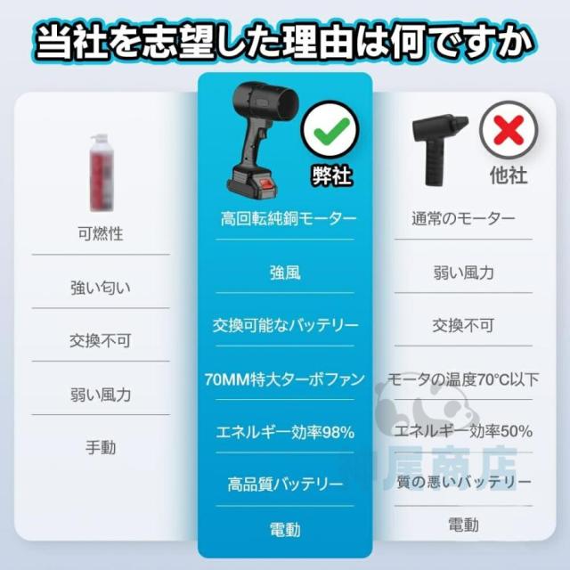 【強力なパフォーマンス】 手に収まるくらいコンパクトでありながら、圧倒的な風力を実現した最強ブロワーです。強力磁石で吹出口を固定し、高効率純銅モーターは最大120000RPMの風速を提供、80mmの大きいファンブレードはより強大な風量と推力を実現しました。