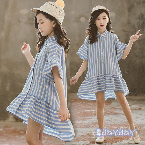 子供服 ワンピース キッズ 子供ドレス dress 子供服 ジュニア 女子 夏 半袖 シャツワンピース 膝丈 ストライプ カジュアル おしゃれ 可愛い 通学着