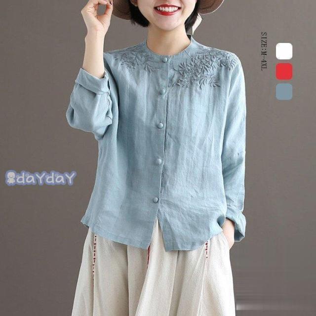 シャツ 刺繍 ブラウス トップス シャツブラウス レディース 前開き 長袖 柄 亜麻 麻 リネン 綿麻 ボタンデザイン ゆったり シンプル カジュアル 可愛い 春 30代