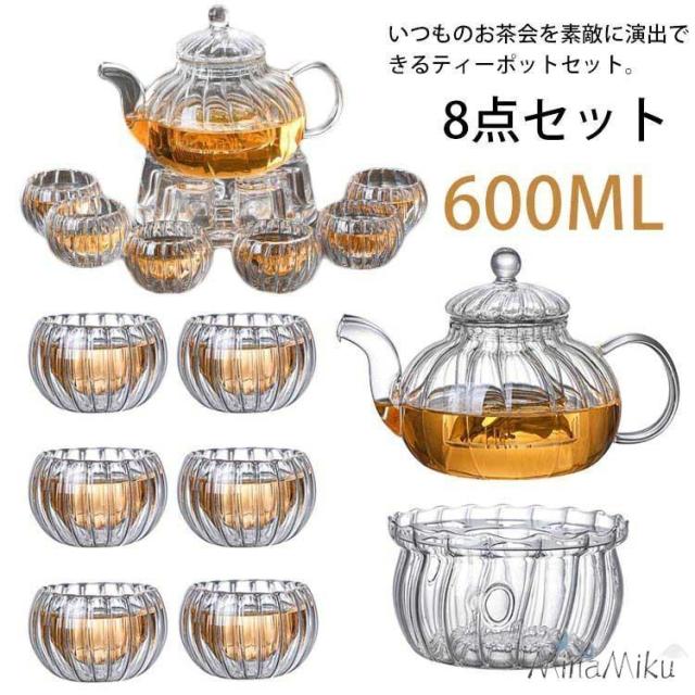 8点セット ティーポット 600ml 茶こし付き 直火対応 耐熱ガラス ウォーマー付き ガラスポット ティーセット ガラス 急須 湯呑み ティーフォー