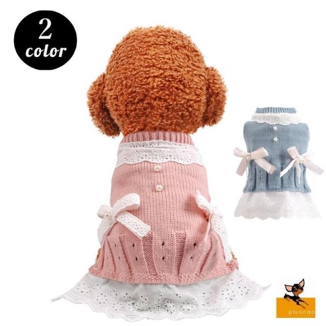 ドッグウェア ワンピース ニット 犬服 猫服 犬用ウェア ペットウェア 秋冬 小型犬 レース リボン ピンク ブルー 可愛い おしゃれ お散歩 記念写