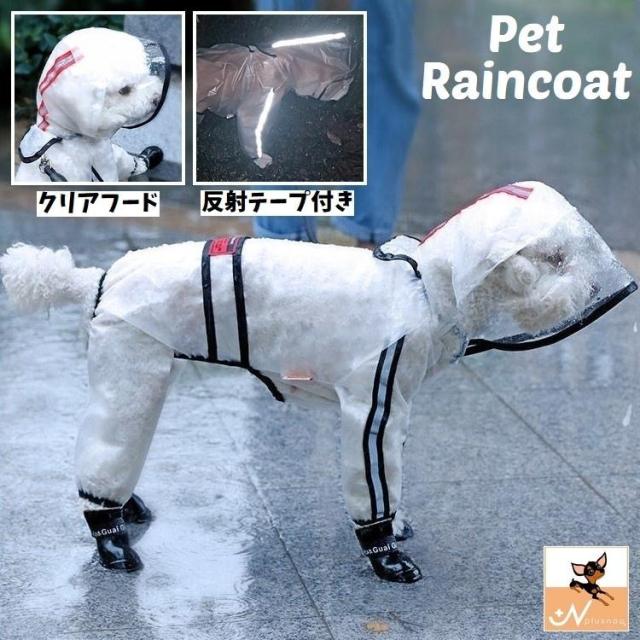 レインコート 犬用 ドッグ ペットウェア 雨具 合羽 カッパ カバーオール つなぎ フルカバー 前開き ボタン フード付き 袖あり 反射テープ 半透明