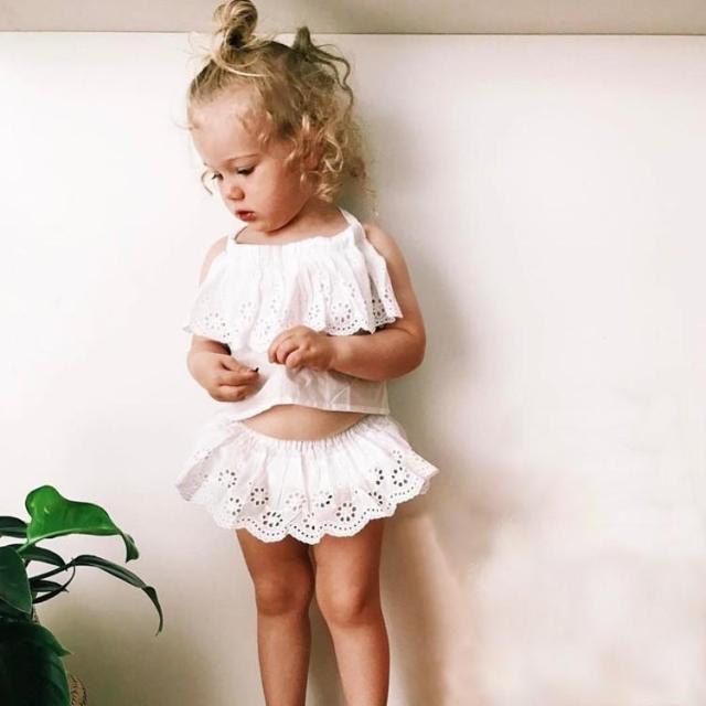 フリルがキュートなホルターネックキャミソール&透かしデザインがステキなスカート付きブルマパンツのベビーウェア上下2点セットです。