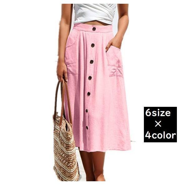 スカート マキシスカート レディース ボトムス ロング Aライン フレア 細め ポケット 両サイドポケット フロントボタン シンプル 無地 柄なし 着