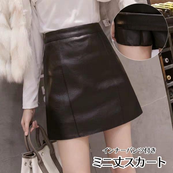 スカート ミニ丈 レザー調 レディース ボトムス ショート 膝上丈 無地 黒 Aライン インナーパンツ付き 定番 シンプル おしゃれ 大きいサイズあり