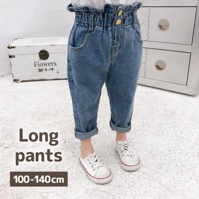 ロングパンツ ロールアップデニム デニムパンツ 長ズボン ボトムス キッズ 女の子 ハイウエスト ウエストフリル ウエストゴム ポケット付き バックポ