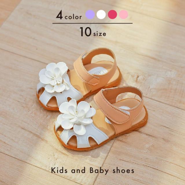 サンダル キッズ ベビー 女の子 子供靴 シューズ アンクルストラップ フラット ぺたんこ 滑り止め マジック テープ 可愛い 花 フラワー フェイク