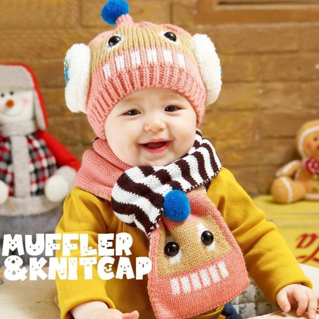 子供用 ニット帽 マフラー 2点セット セットアップ ロボットデザイン ベビー キッズ 女の子 男の子 冬帽子