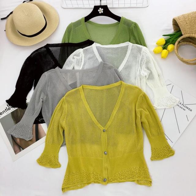 カーディガン 透かしカーディガン サマーカーディガン ショートカーディガン 透かし編み ニット風 半袖 5分袖 Vネック ボタン 前開き ショート丈