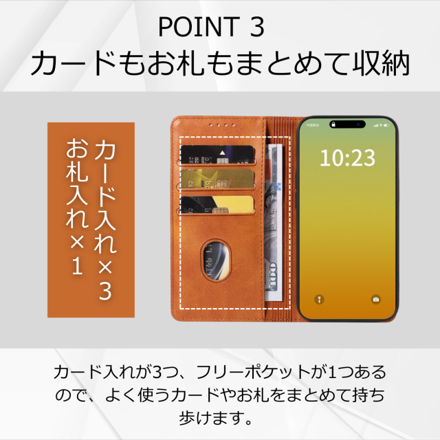 収納:カードポケット×3、紙幣やレシートが入るフリーポケット×1