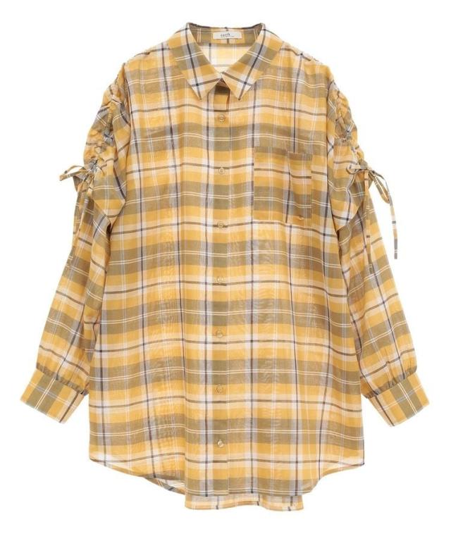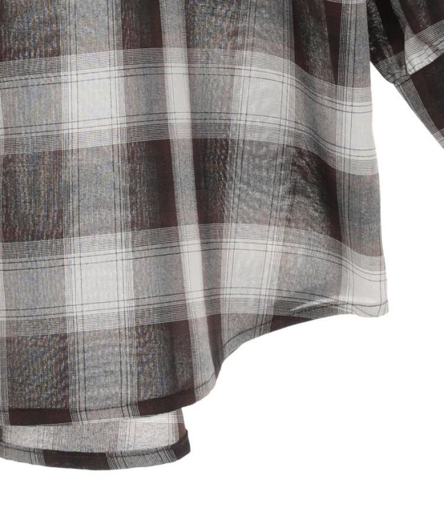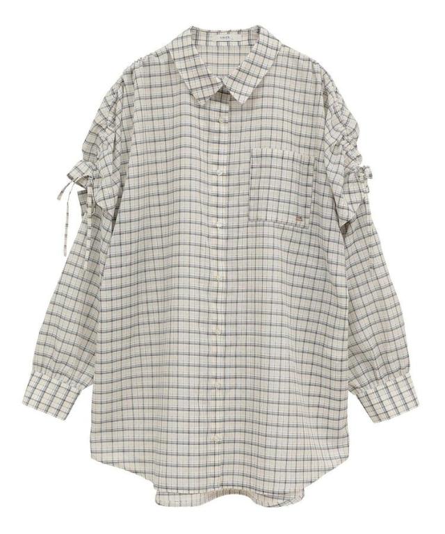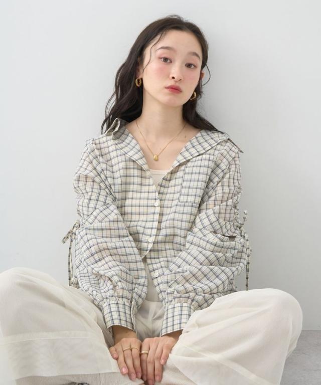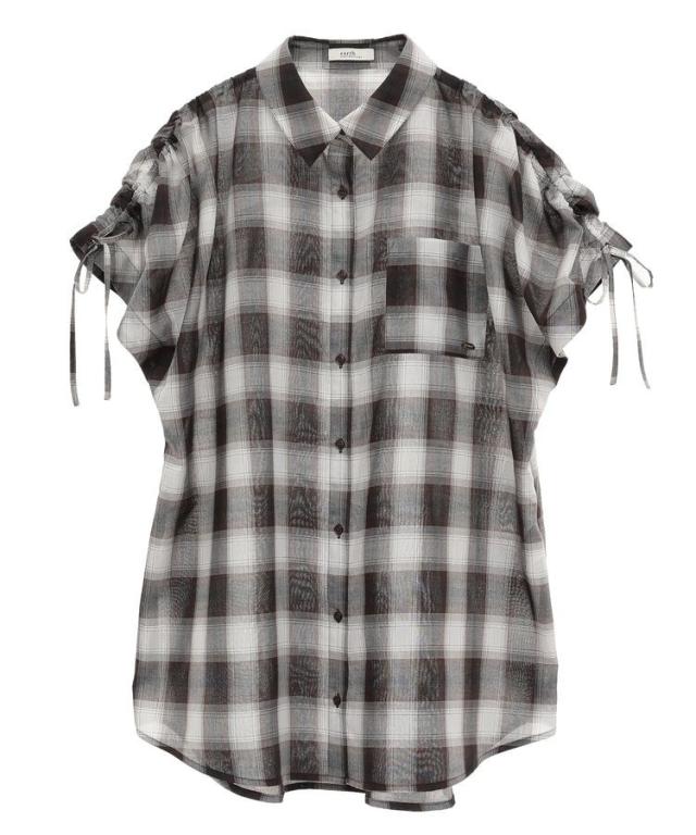 程よくシアーなチェック柄生地で仕立てたシャツ。肩のドロストリボンを調整し、お好みでギャザーを寄せた女性らしいフォルムに変えられます。腕のボタンを外せば半袖になり、暑い季節にも快適に着用できる2WAY仕様なのも魅力的。合わせ方次第でロングシーズン活躍するおすすめのひと品です。透け感[ややあり]