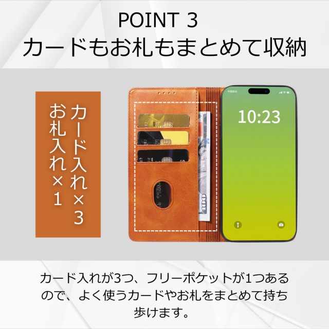 収納:カードポケット×3、紙幣やレシートが入るフリーポケット×1