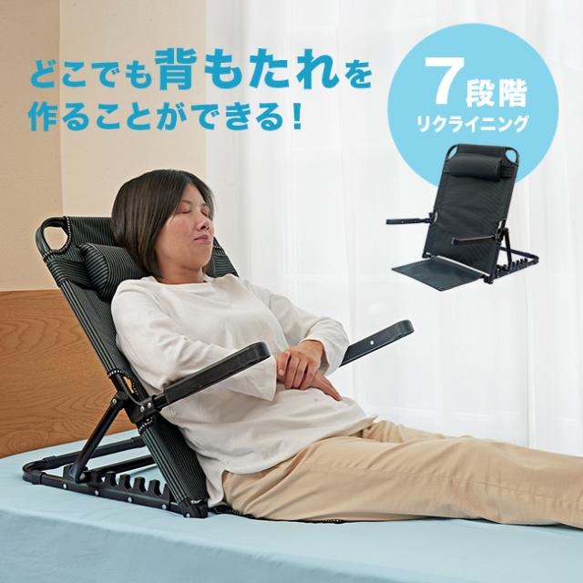 ベッドの上や和室、アウトドアでも大活躍。置くだけでしっかり身体を支えてくれる、リクライニング機能付きの背もたれシートです。