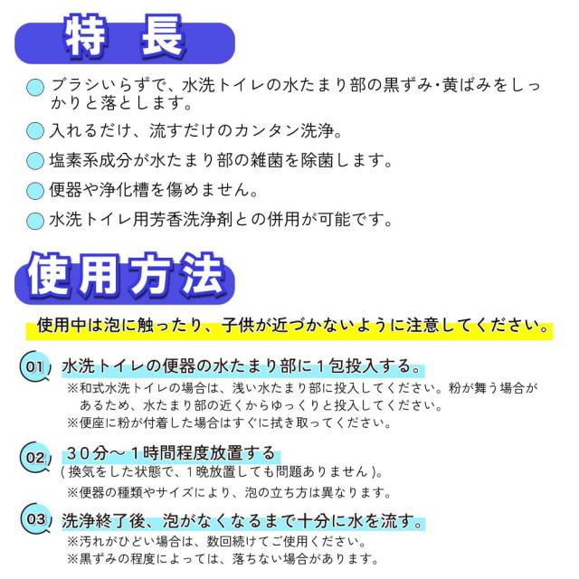 ※和式水洗トイレの場合は、浅い水たまり部に投入してください。粉が舞う場合があるため、水たまり部の近くからゆっくりと投入してください。