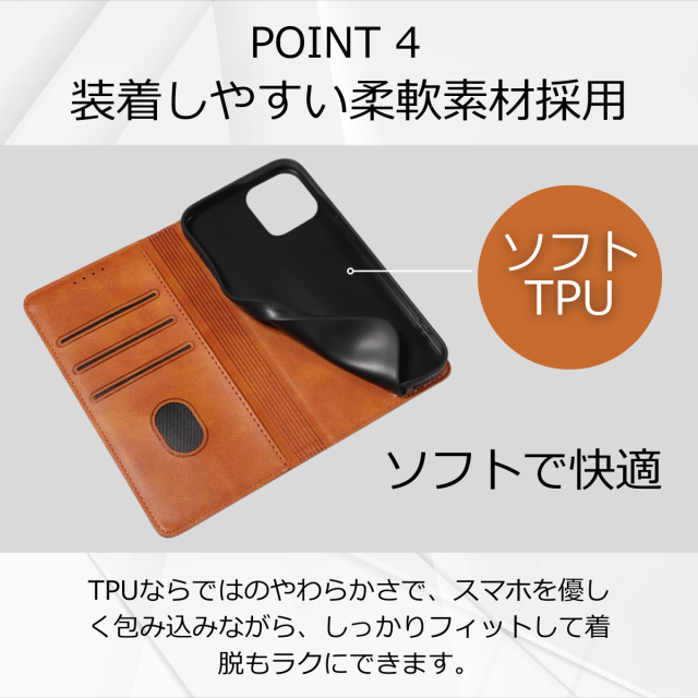 外側は高級感のあるPUレザー、内側は衝撃をやわらげるTPU素材を採用し、大切な端末をしっかり保護します。