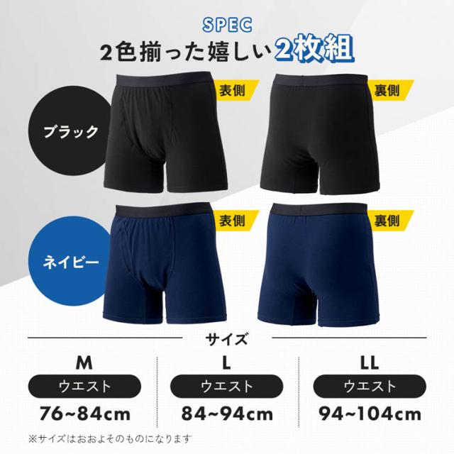 | ・内容量/2枚組(ブラック・ネイビー各1枚) ・商品サイズ/ウエスト(約)76〜84cm ・材質/身生地:綿95%・ポリウレタン5%、防水布部:ポリエステル・ポリウレタン、ゴム部:ナイロン45%・ポリエステル45%・ポリウレタン10% |