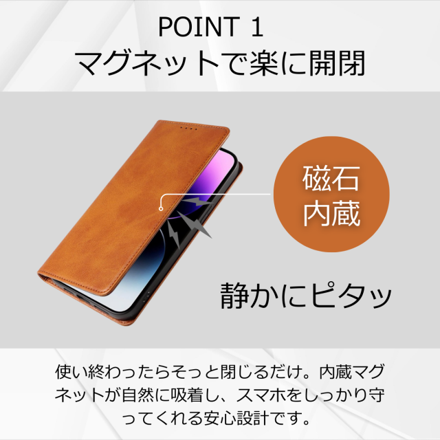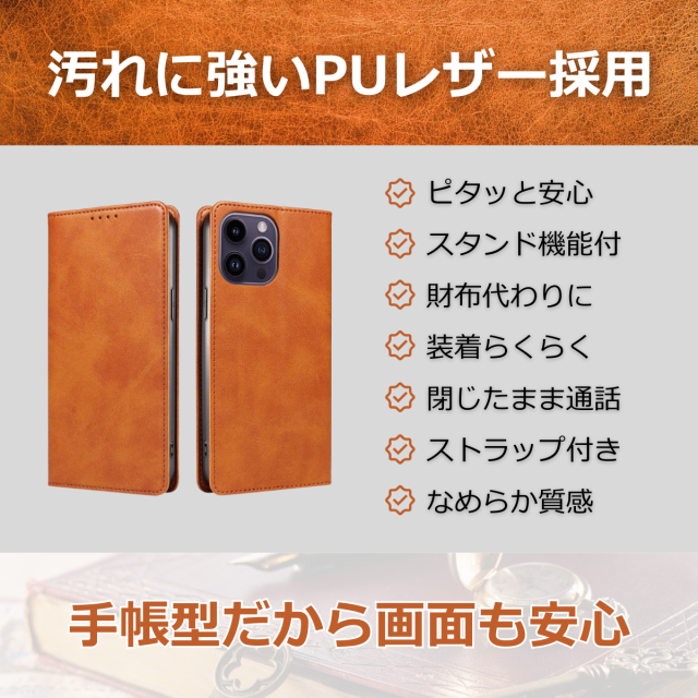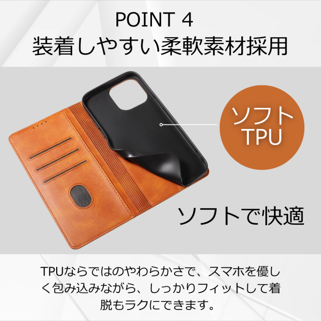 外側は高級感のあるPUレザー、内側は衝撃をやわらげるTPU素材を採用し、大切な端末をしっかり保護します。