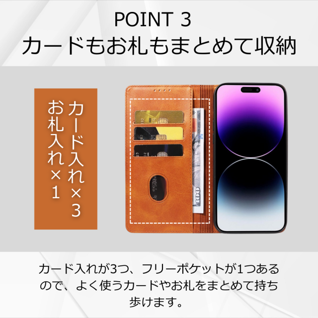 収納:カードポケット×3、紙幣やレシートが入るフリーポケット×1