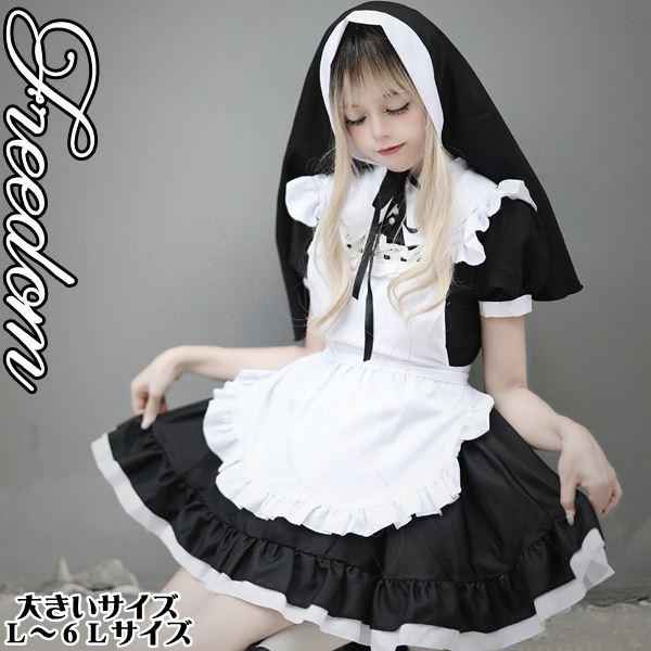 大きいサイズ メイド コスチューム アイドル ハロウィン コスプレ 衣装 修道女とメイドが合体!修道女帽子付きフリルエプロンメイド服 L 2L 3L 4L 5L 6L セール