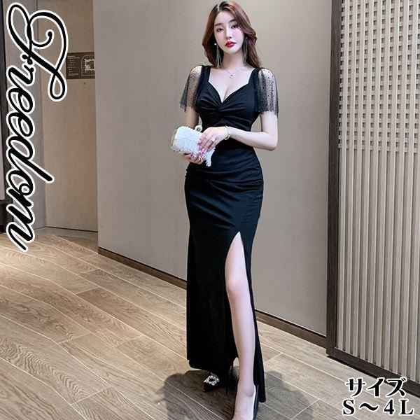 ロングドレス キャバドレス チャイナドレス 大きいサイズ 深V胸谷間魅せギャザ入りSライン前スリット入りセクシーロングドレス S M L 2L 3L 4L サイズ セール