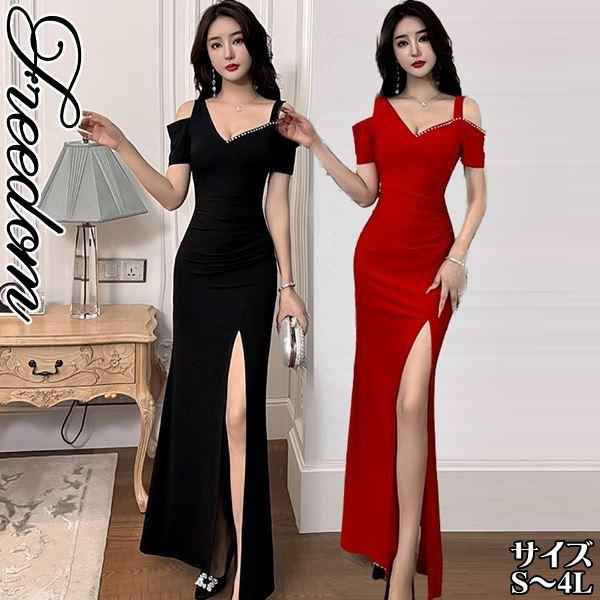 キャバ ドレス キャバドレス ロングドレス セクシー 大きいサイズ アシメ肩出し胸元パール使い前スリット入りロングドレス S M L 2L 3L 4L サイズ セール