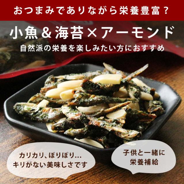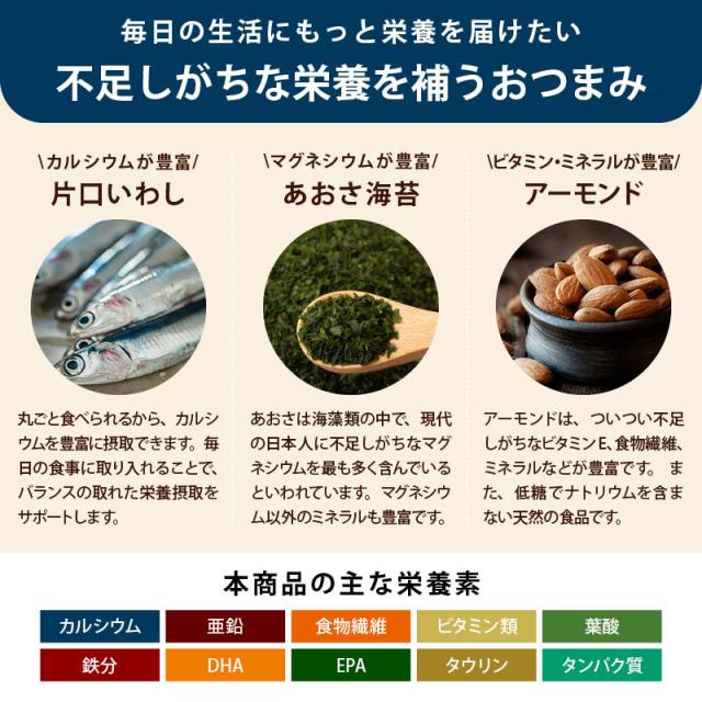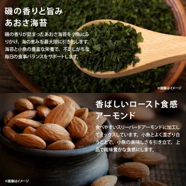 ◆商品説明:片口いわしに、磯の香り豊かなあおさをふりかけた『あおさ小魚』に『アーモンド 』をプラスしました。