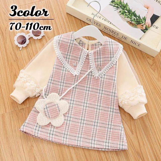 ワンピース 長袖 子供服 ベビー キッズ 女の子 Aライン チェック ビッグカラー ポシェット風 飾り付き 重ね着風 フェイクレイヤード レース おし