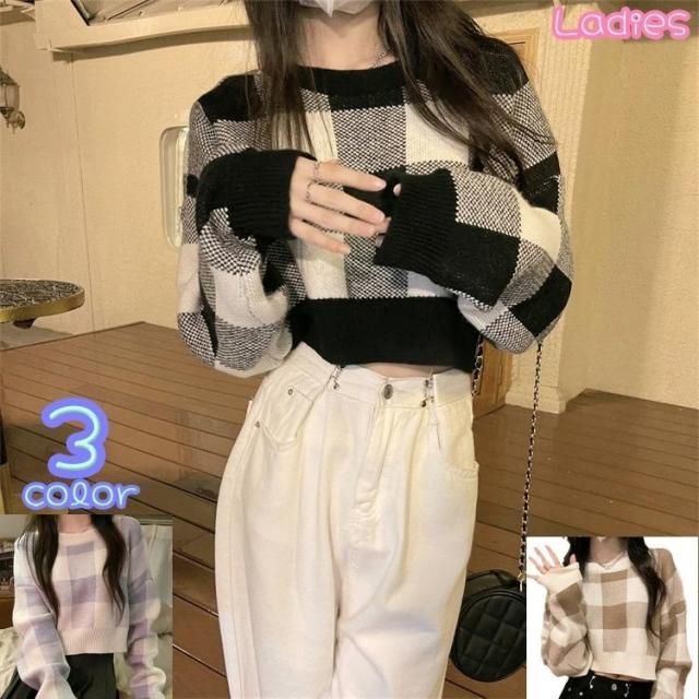 長袖ニット セーター レディース トップス プルオーバー ショート丈 ラウンドネック ロングスリーブ 女性 かわいい チェック柄 韓国 韓国ファッショ