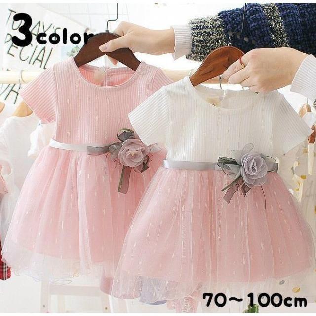 半袖ワンピース 子供服 キッズ 女の子 トップス ミニ丈 ミディアム丈 膝丈 切り替え チュール レース 花 薔薇 コサージュ 水玉 ドット フレア