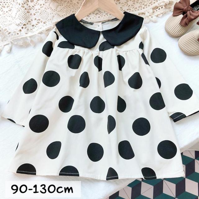 ワンピース 長袖 子供服 キッズ ベビー 女の子 襟付き 丸襟 ドット柄 ダルメシアン風 Aライン 後ろボタン フレア おしゃれ かわいい モダン お