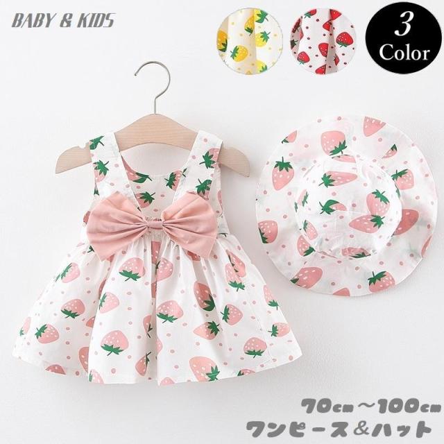 ワンピース 2点セット ベビー キッズ 女の子 ハット 帽子付き ノースリーブ リボン イチゴ フルーツ 春 夏 可愛い 70cm 80cm 90cm